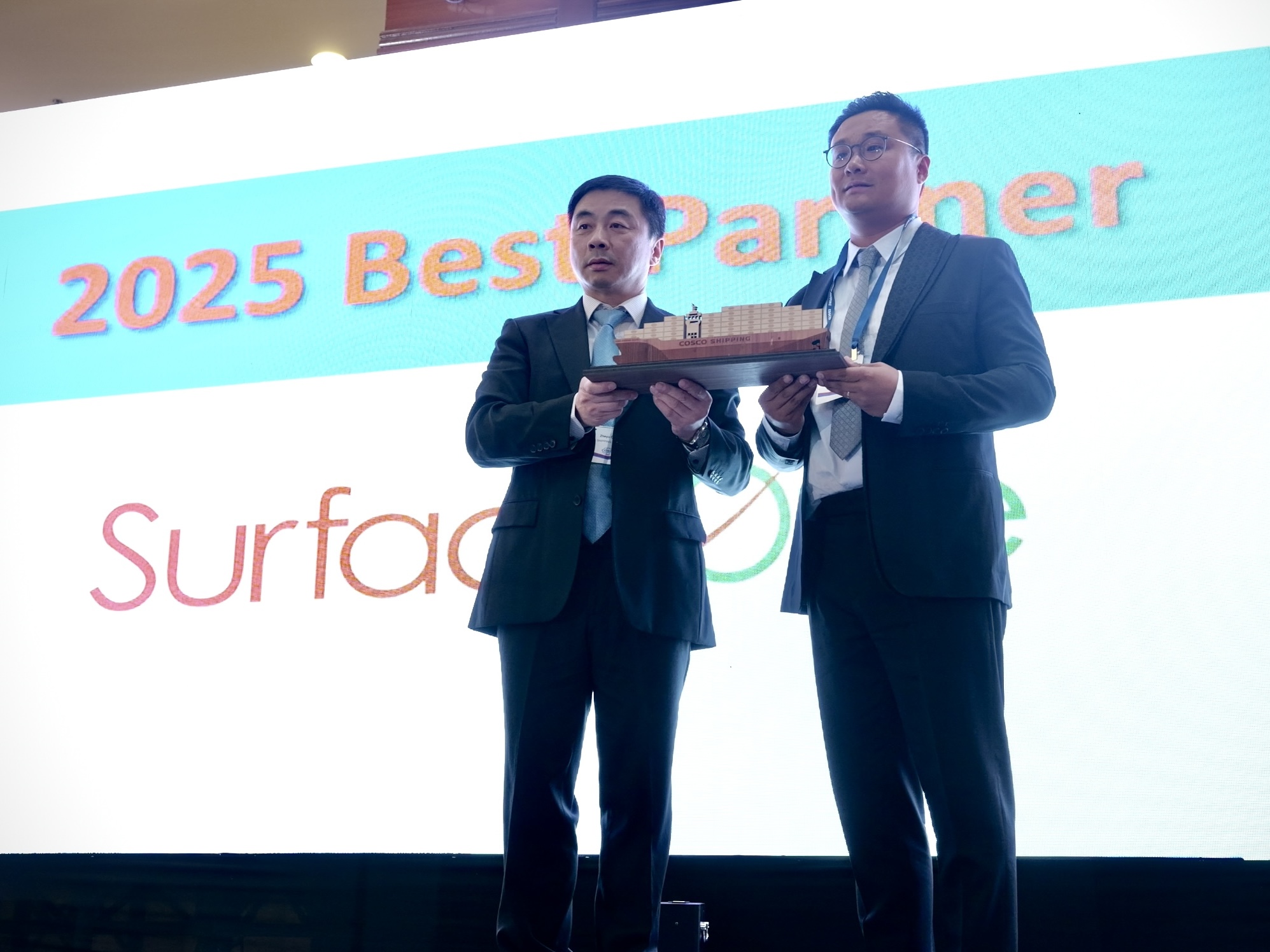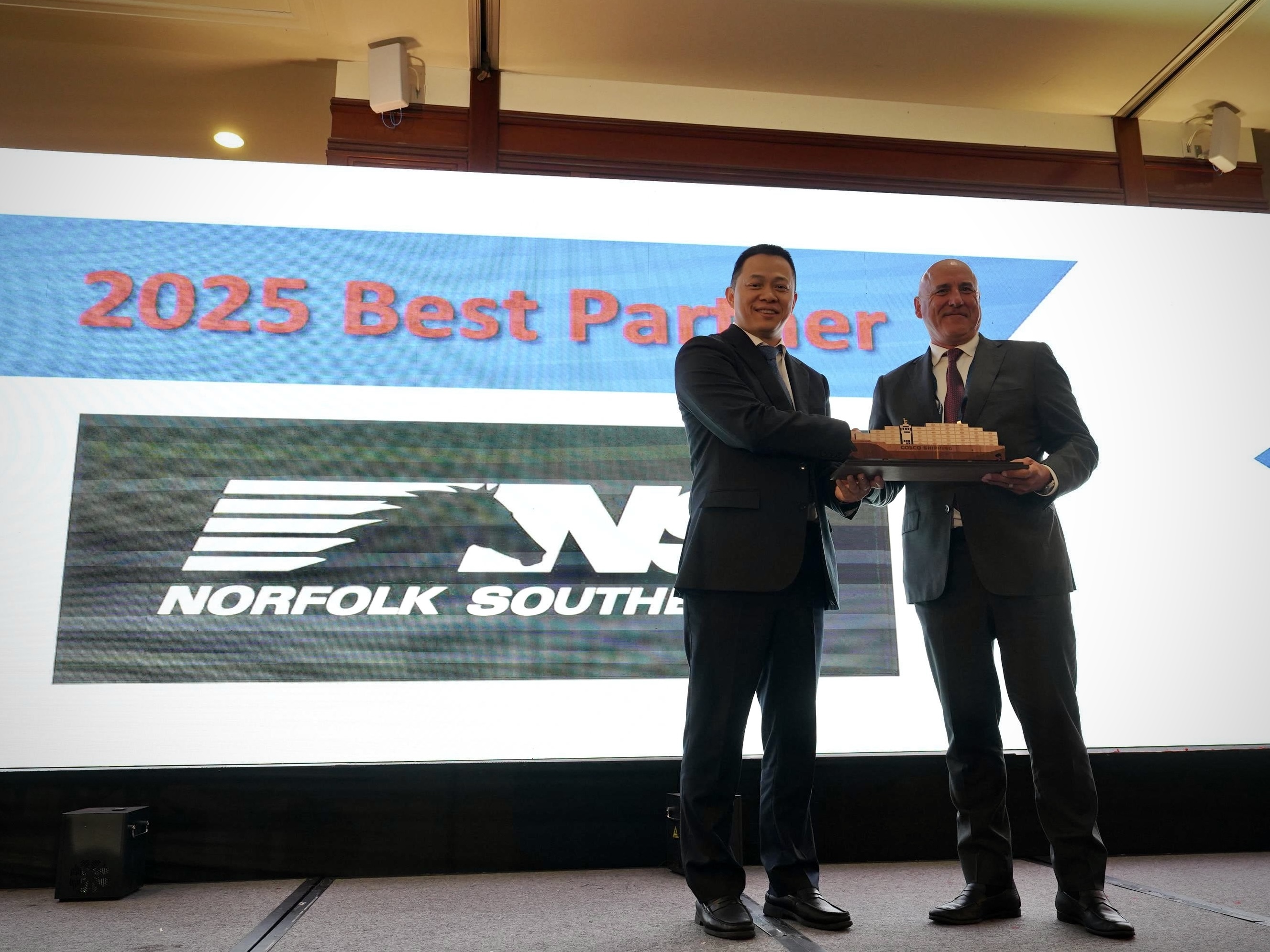 During the reception, COSCO SHIPPING North America honored several partners for their outstanding collaboration and operational excellence in 2025. Award recipients included port partner Long Beach Container Terminal; rail partner Norfolk Southern; trucking and warehousing partners TWTH EXPRESS and SurfaceOne; and financial partner Bank of China, New York Branch.